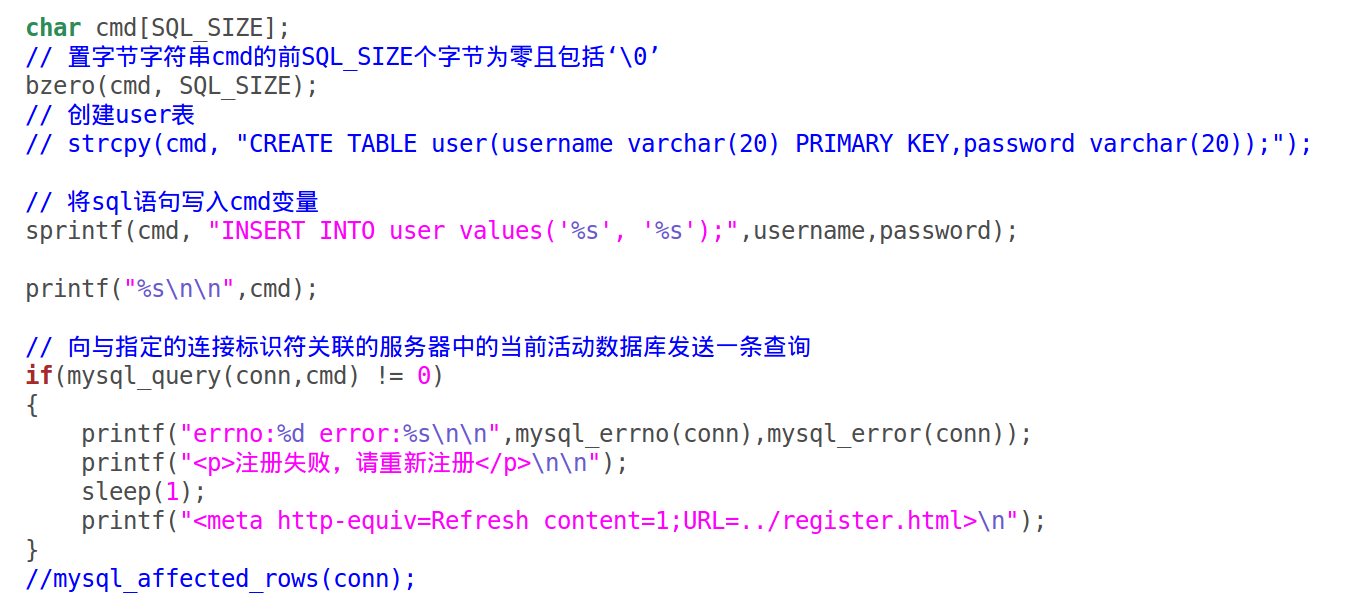 sprintf(cmd, "INSERT INTO user values('%s', '%s');",username,password);